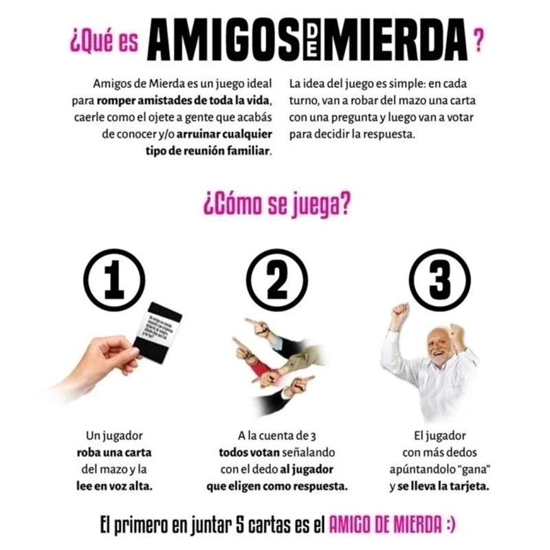 AMIGOS DE MIERDA - BURÓ es un juego de cartas para 2 a 22 jugadores (recomendado: 5+) que se juega en un tiempo de entre 20 y 40 minutos.